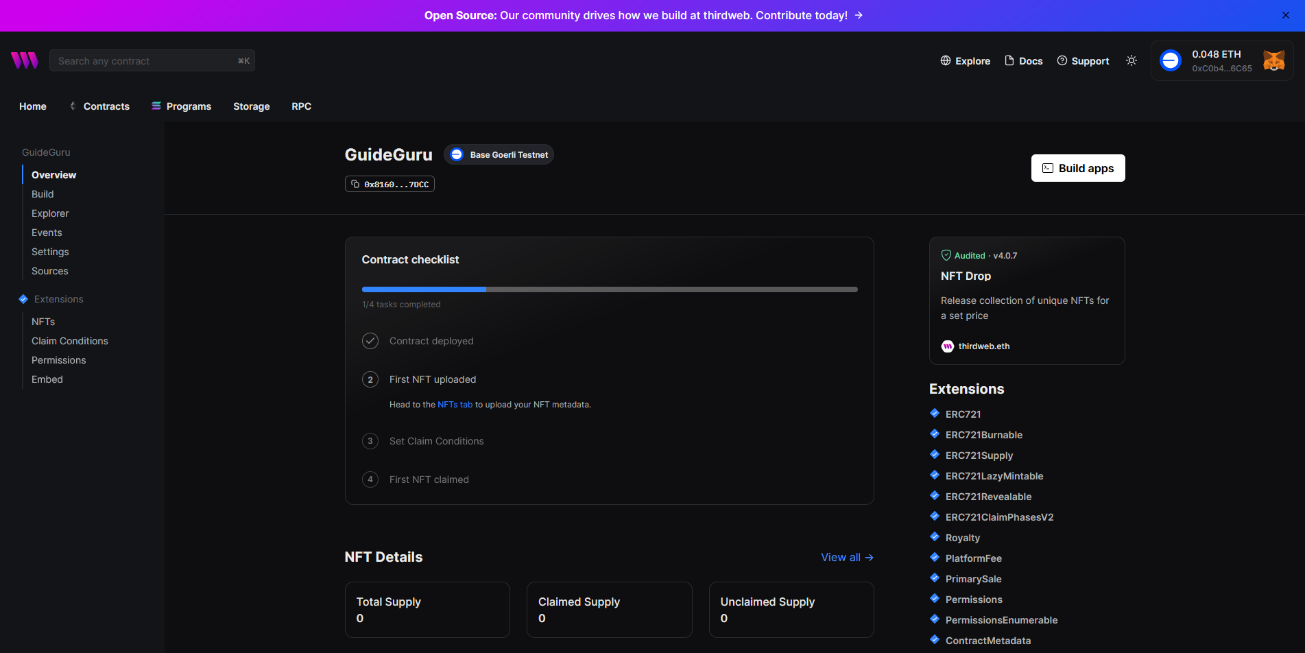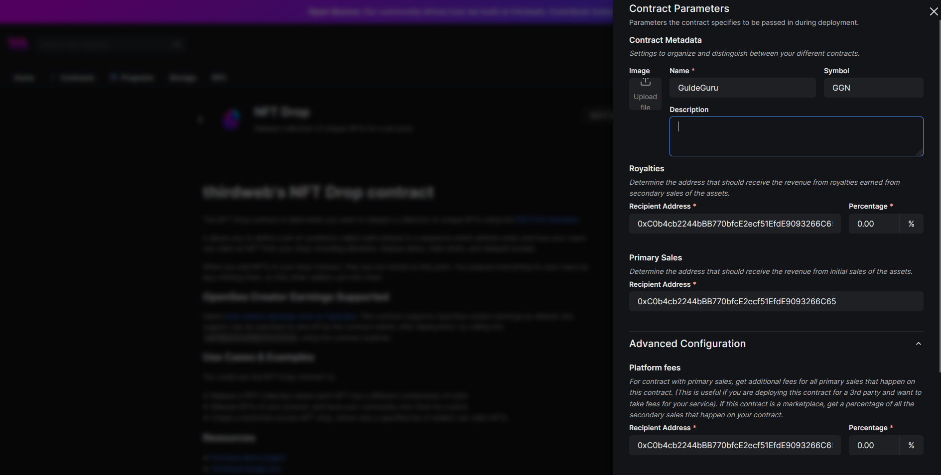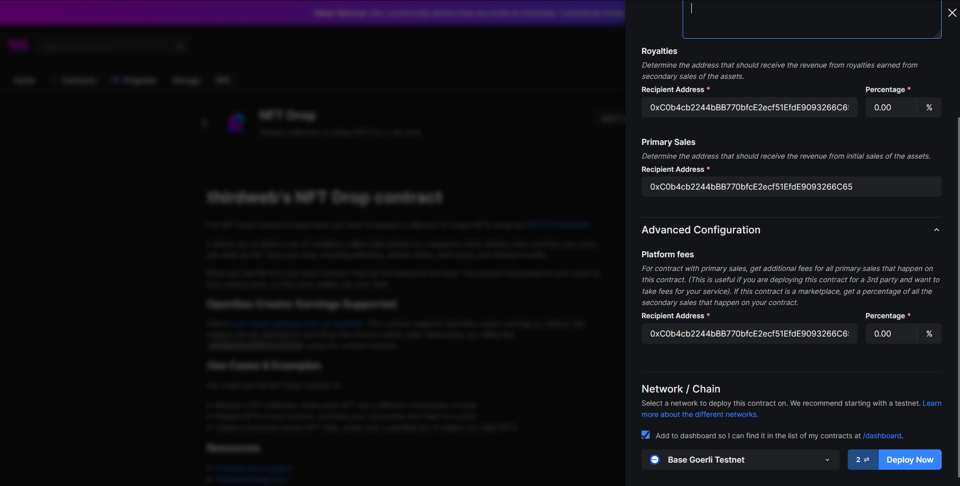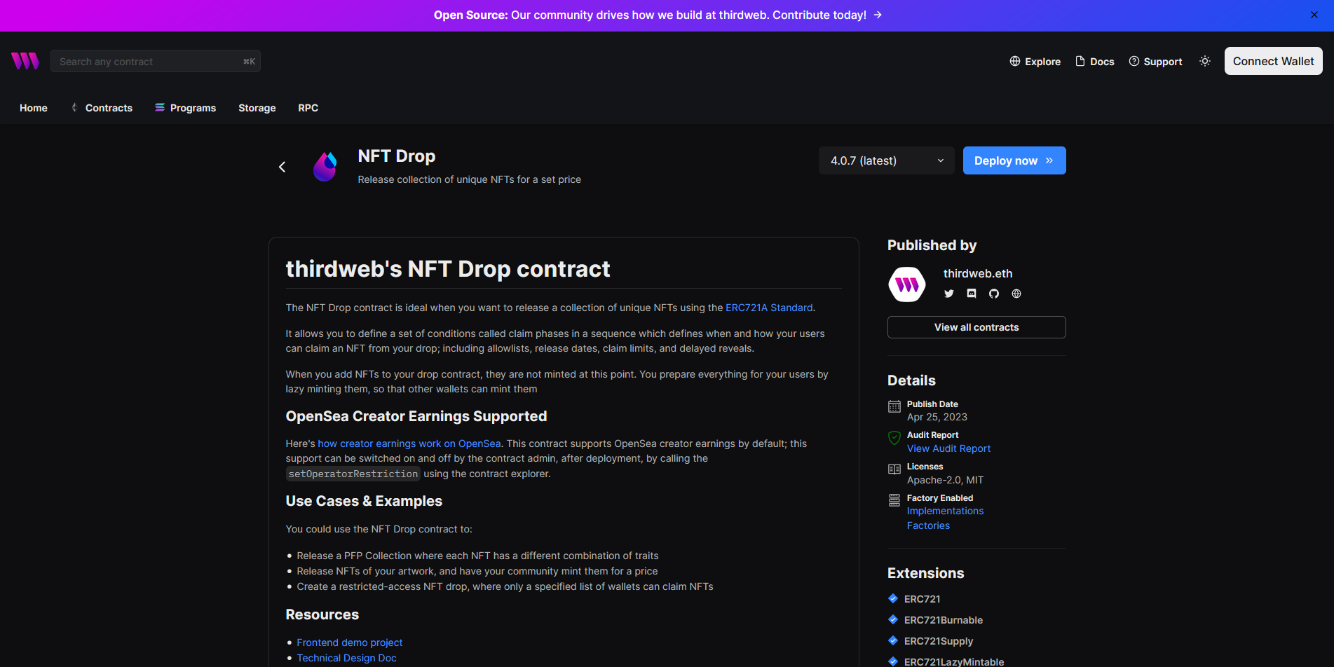 Now go to thirdweb.com/thirdweb.eth/DropERC721, connect your wallet & select "Deploy now".