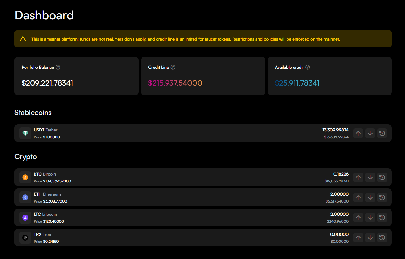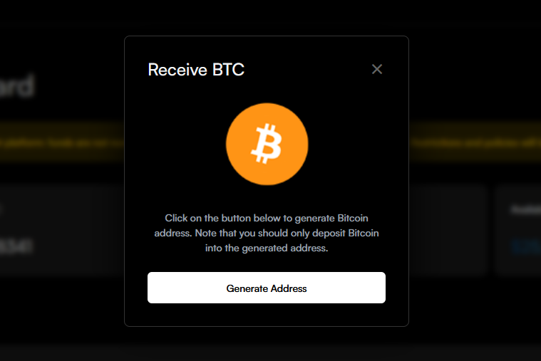 * If you have tBTC from previous Bitcoin testnets, you can send some to Liqfinity by going to the Dashboard and pressing the down arrow to receive, then press "Generate Address", use this address to send tBTC from an external wallet such as UniSat or XVERSE.