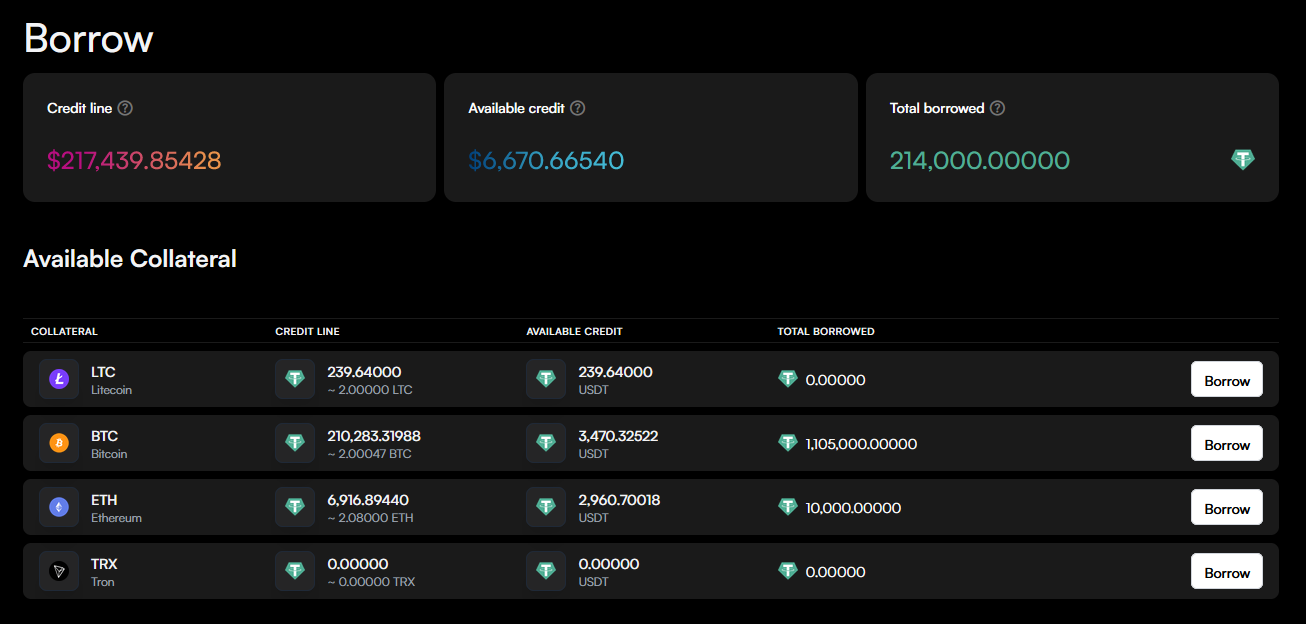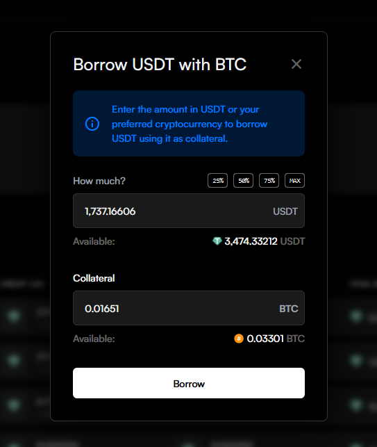 Insert any amount of USDT that you want to borrow, press Borrow, then Confirm.