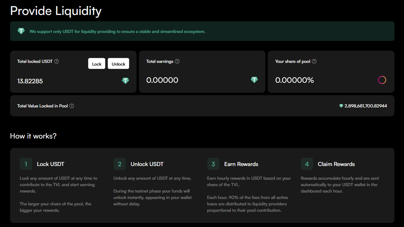 Now head over to the Provide Liquidity page, here you can lock & unlock your USDT. If you want to maximise your points for the leaderboard, then you should aim to lock/unlock as much as possible.