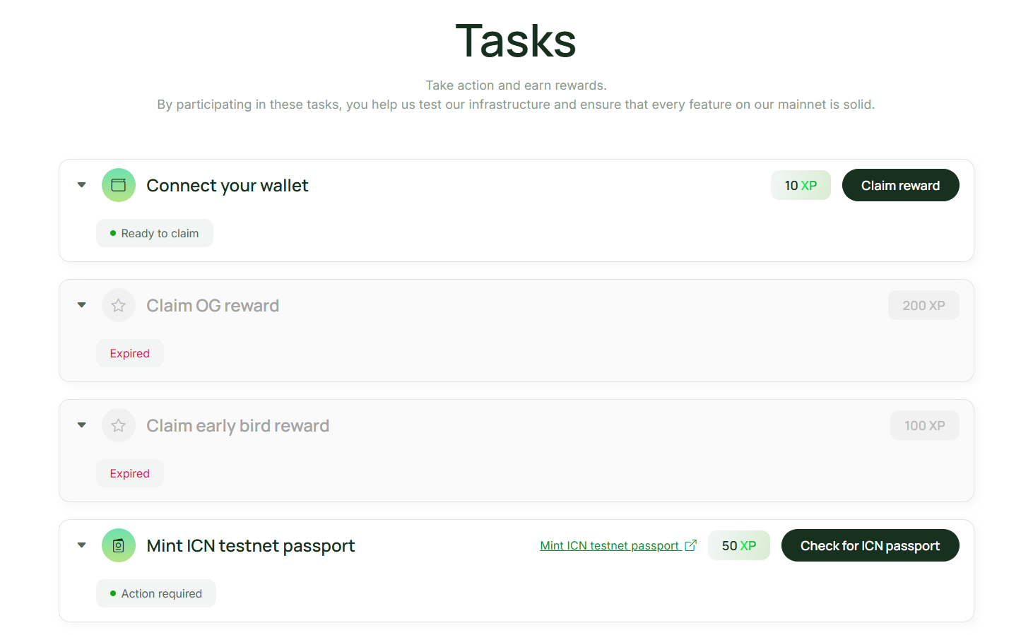 Now head back to: testnet.icn.global, scroll down and there should be some tasks to complete.
