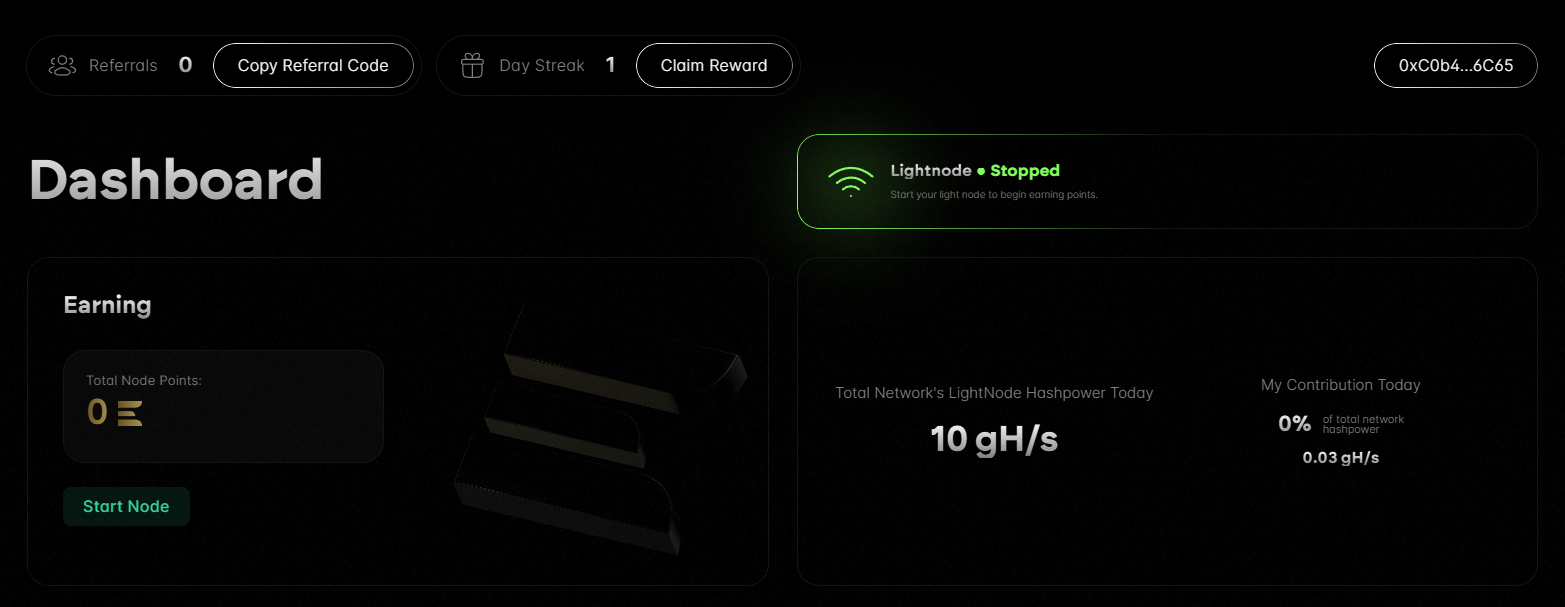 Now you should be in the Dashboard. Here we can see if our Lightnode is active, and how much node points we've earned.