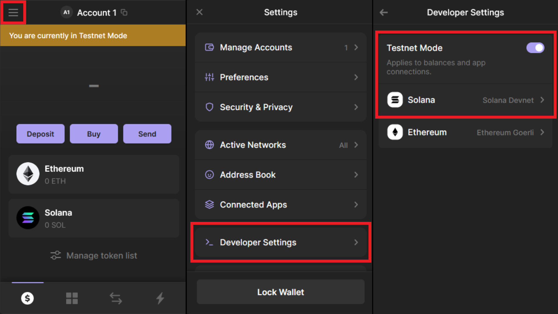 To set Devnet mode, go to "Developer Settings" then turn on "Testnet Mode", make sure Solana is set to "Devnet".