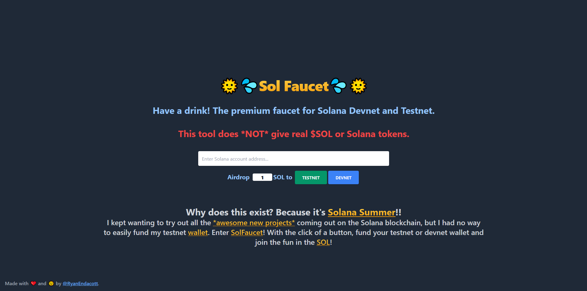 Next, let's claim some test SOL, to do this, go to solfaucet.com, then insert your devnet wallet address from Phantom & finally click the "DEVNET" button to claim.