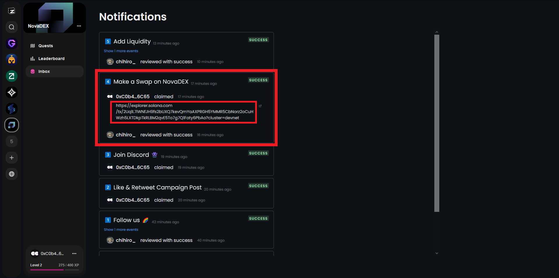 For the "Make a Swap on NovaDEX" & "Add Liquidity" tasks, we need to submit proof of the transactions.