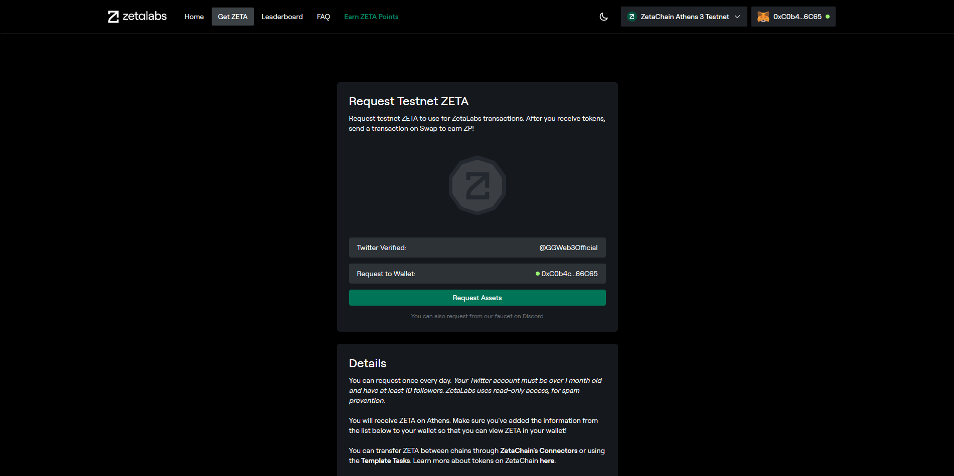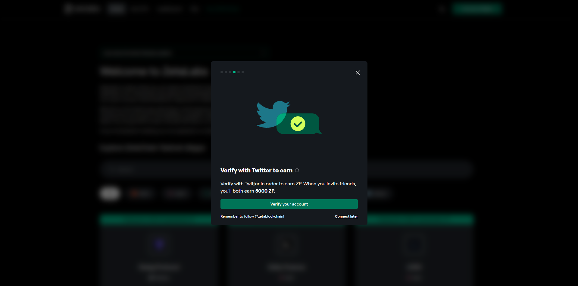 First, we need to go to labs.zetachain.com & verify ourselves by connecting to Twitter/X, then Follow ZetaChain, and finally connect your wallet.
