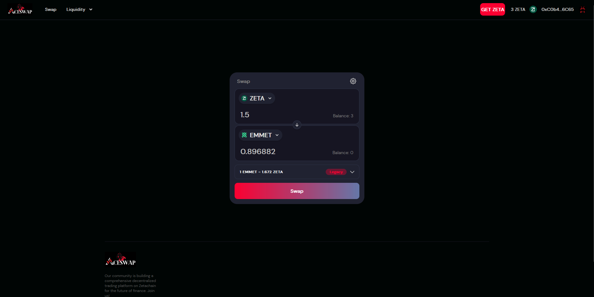 Here we can perform some swaps using our Zeta test tokens, for this guide I'll swap from ZETA to EMMET, then back to ZETA.