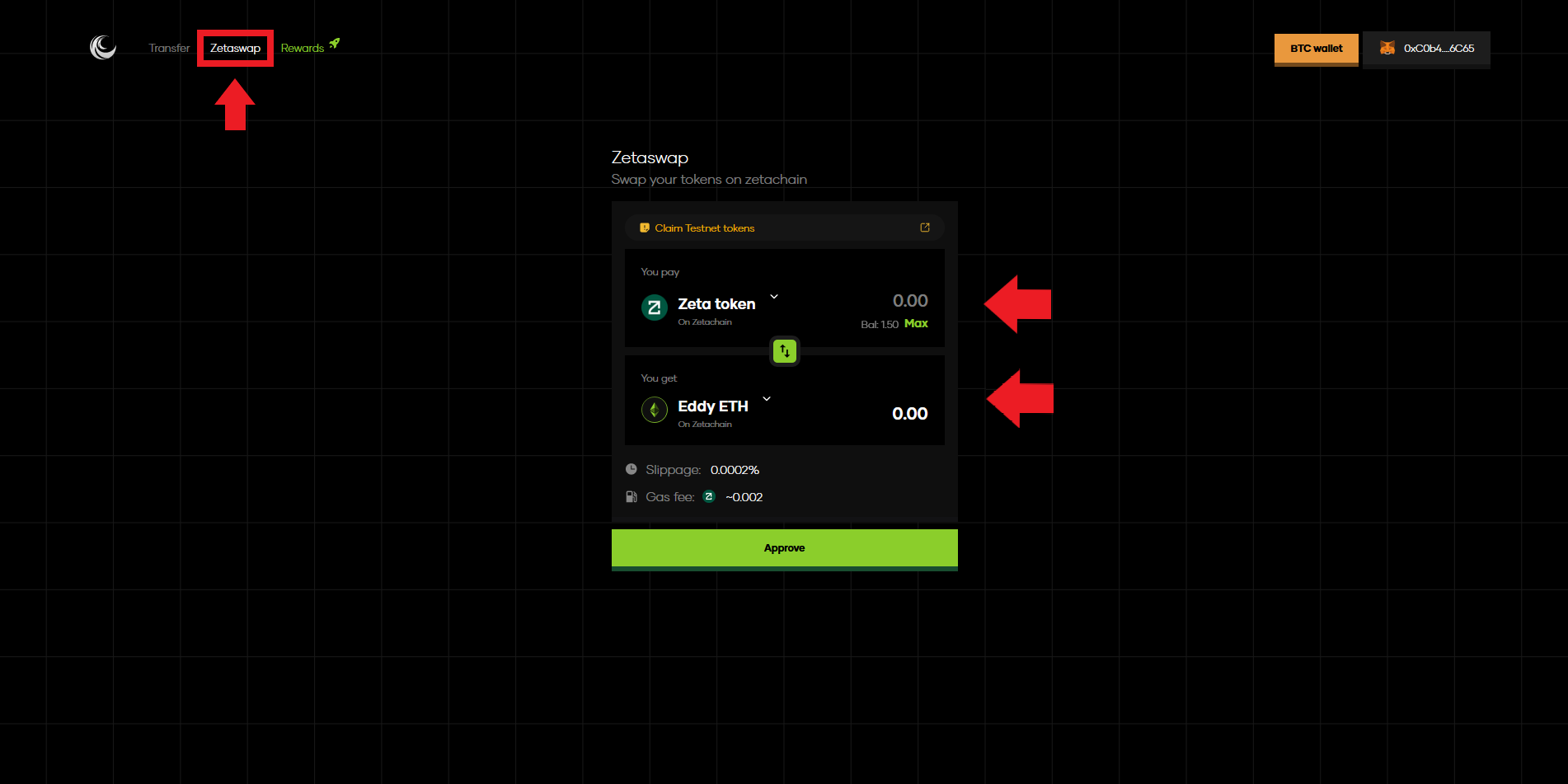 Go to app.eddy.finance, select ZetaSwap & connect your wallet.
