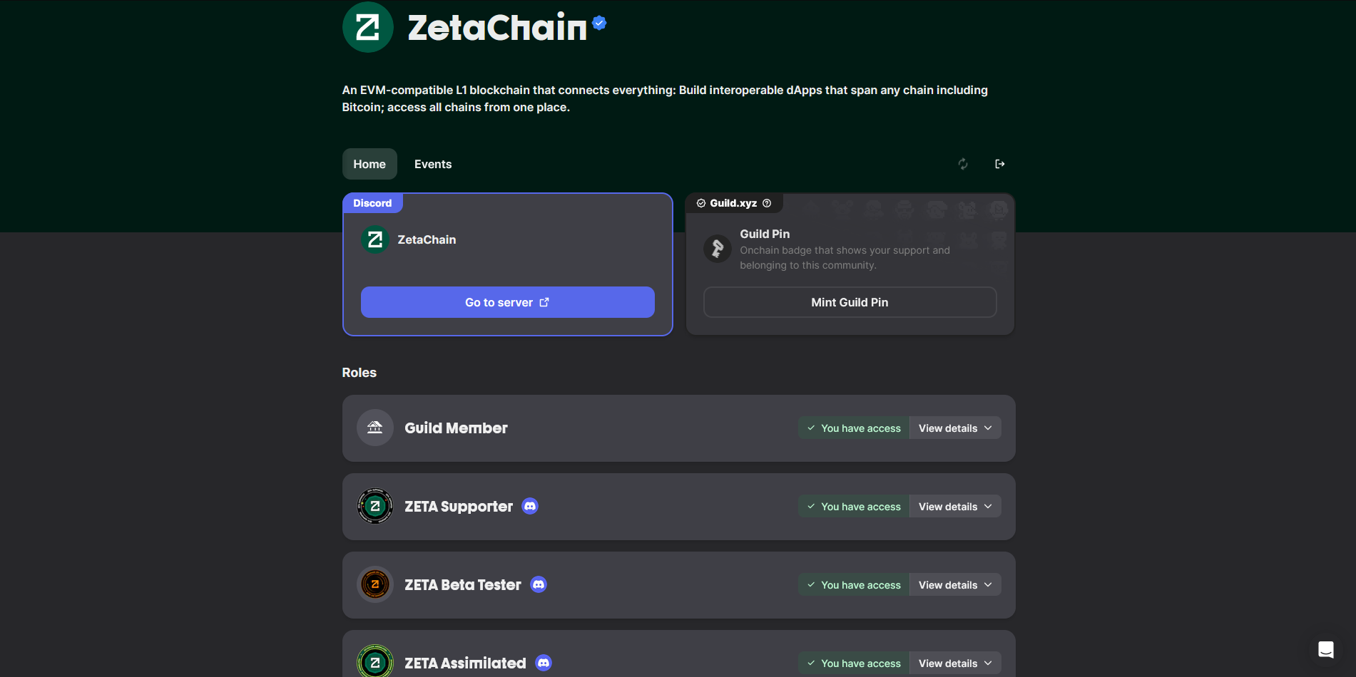Here we can mint the ZetaChain Guild Pin to show we're a true supporter & community member, as well as claim our Roles within the community!