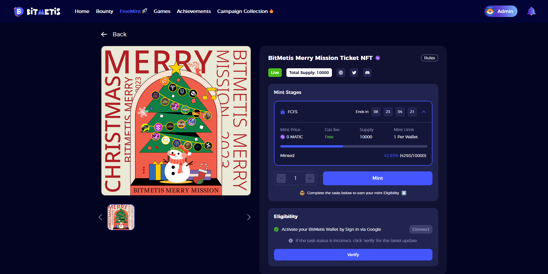 Now we need to mint the free BitMetis Merry Mission Ticket NFT, which'll allow us to take part in the campaign!