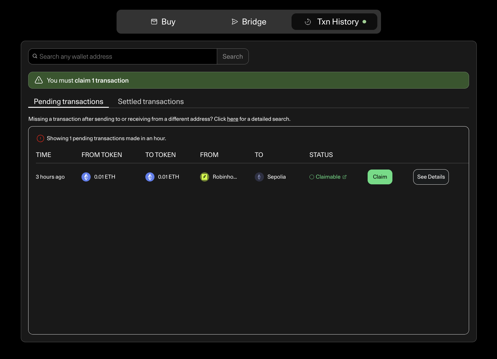 Once transaction is complete, go to the Txn History tab and press Claim.