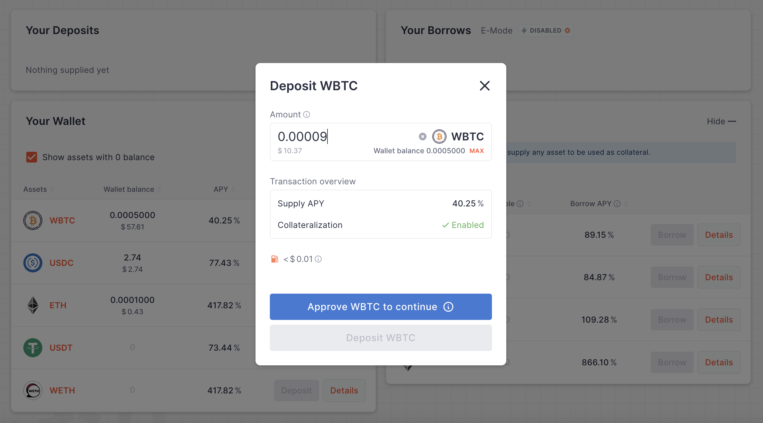 Now you should see your deposit on the left, and on the right you'll now see that we can Borrow assets by using our wBTC as collateral.