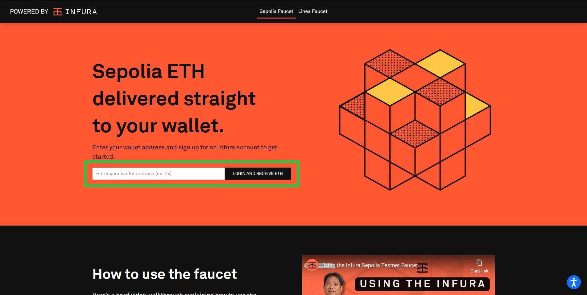 Go to infura.io/faucet/sepolia, insert your wallet address & select "LOGIN & RECEIVE ETH".