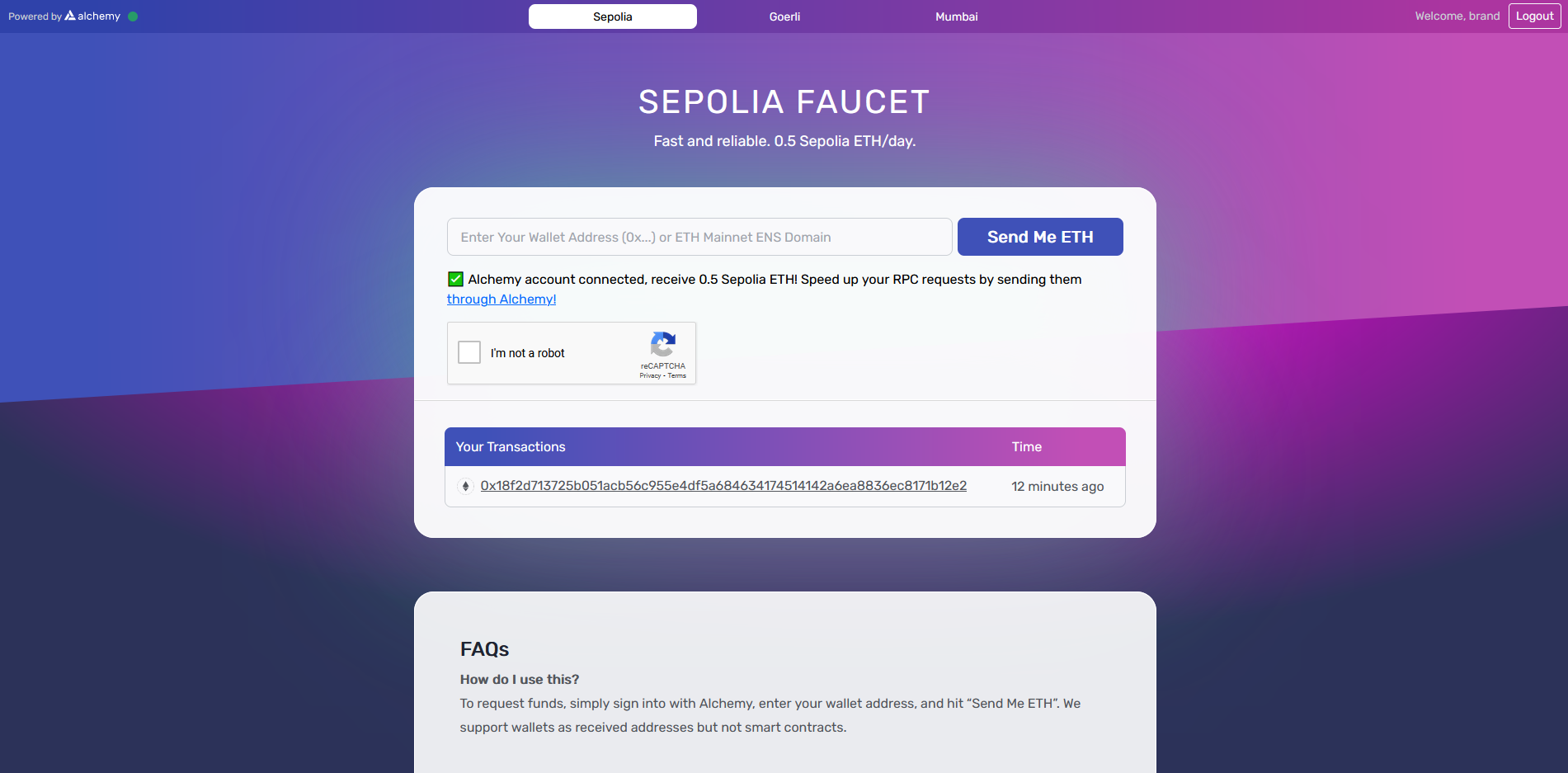 Insert your wallet address & hit "Send me ETH".