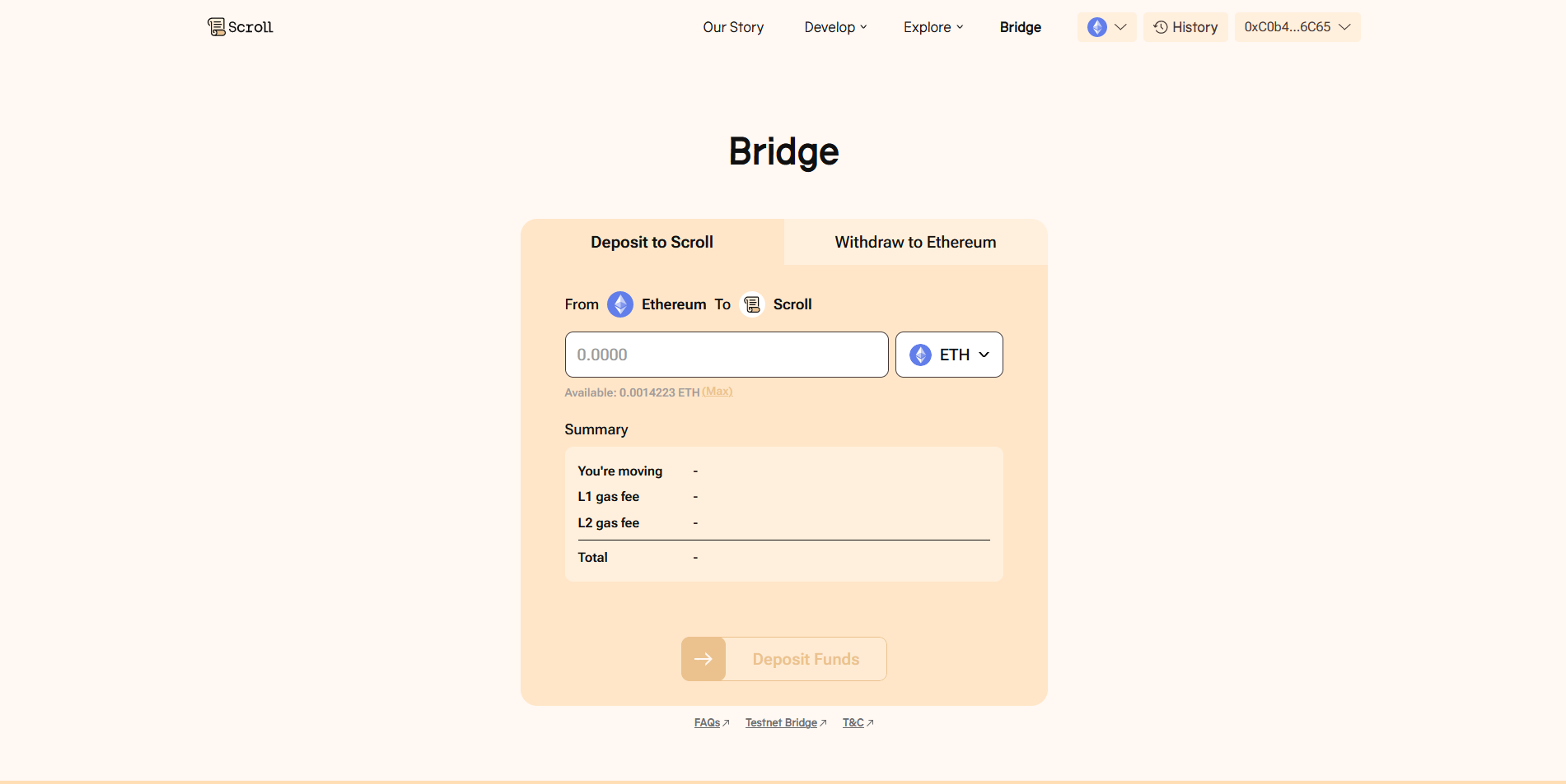 Now make sure you have it set to "Deposit to Scroll", insert an amount & hit "Deposit Funds".