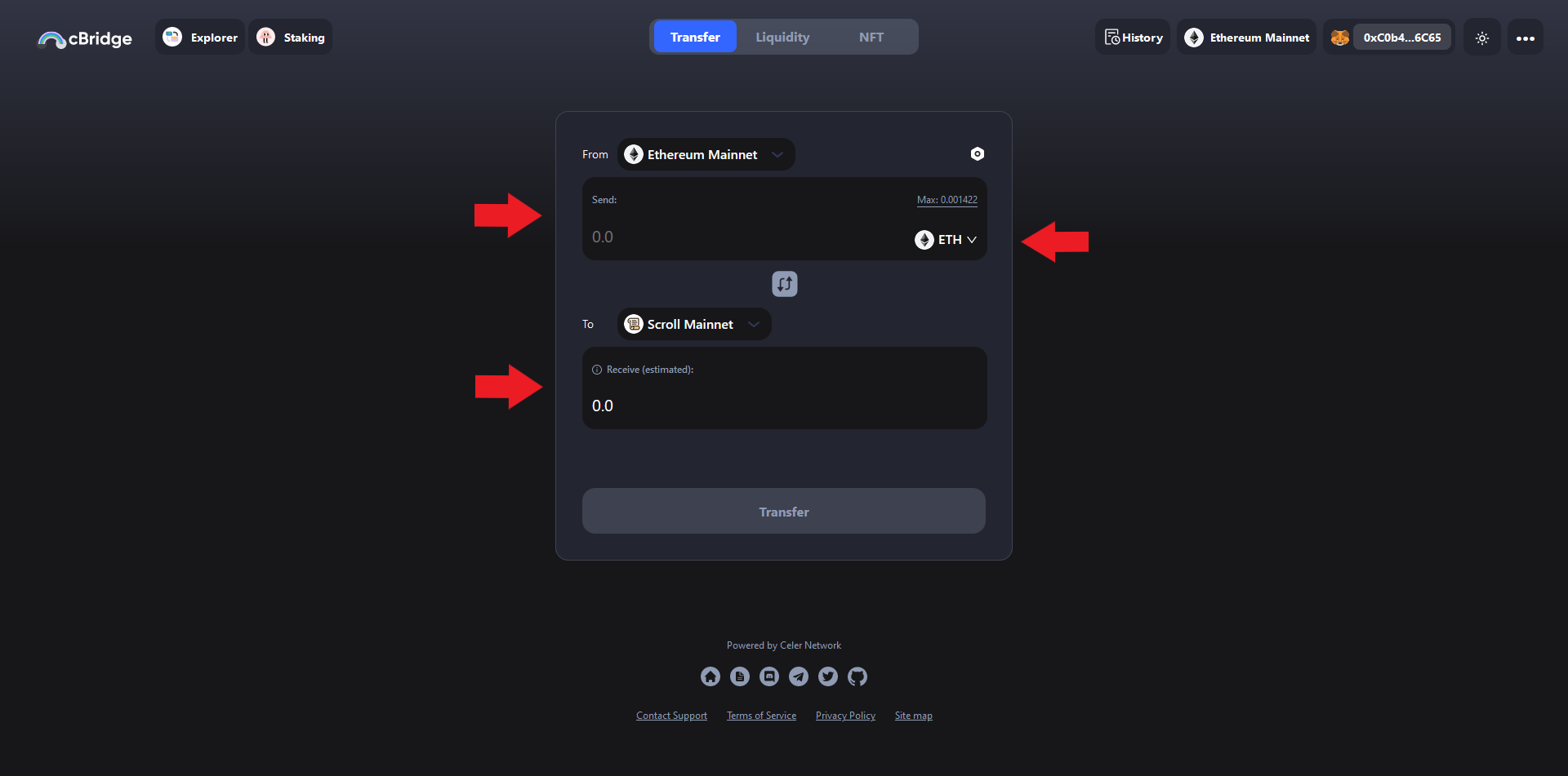 To bridge ETH to Scroll, you'll need to head over to cbridge.celer.network & begin by connecting your wallet.