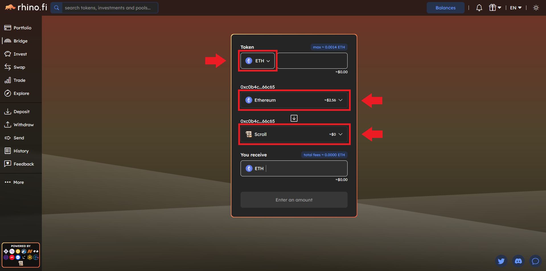 To bridge ETH to Scroll, you'll need to head over to Rhino.Fi & connect your wallet.