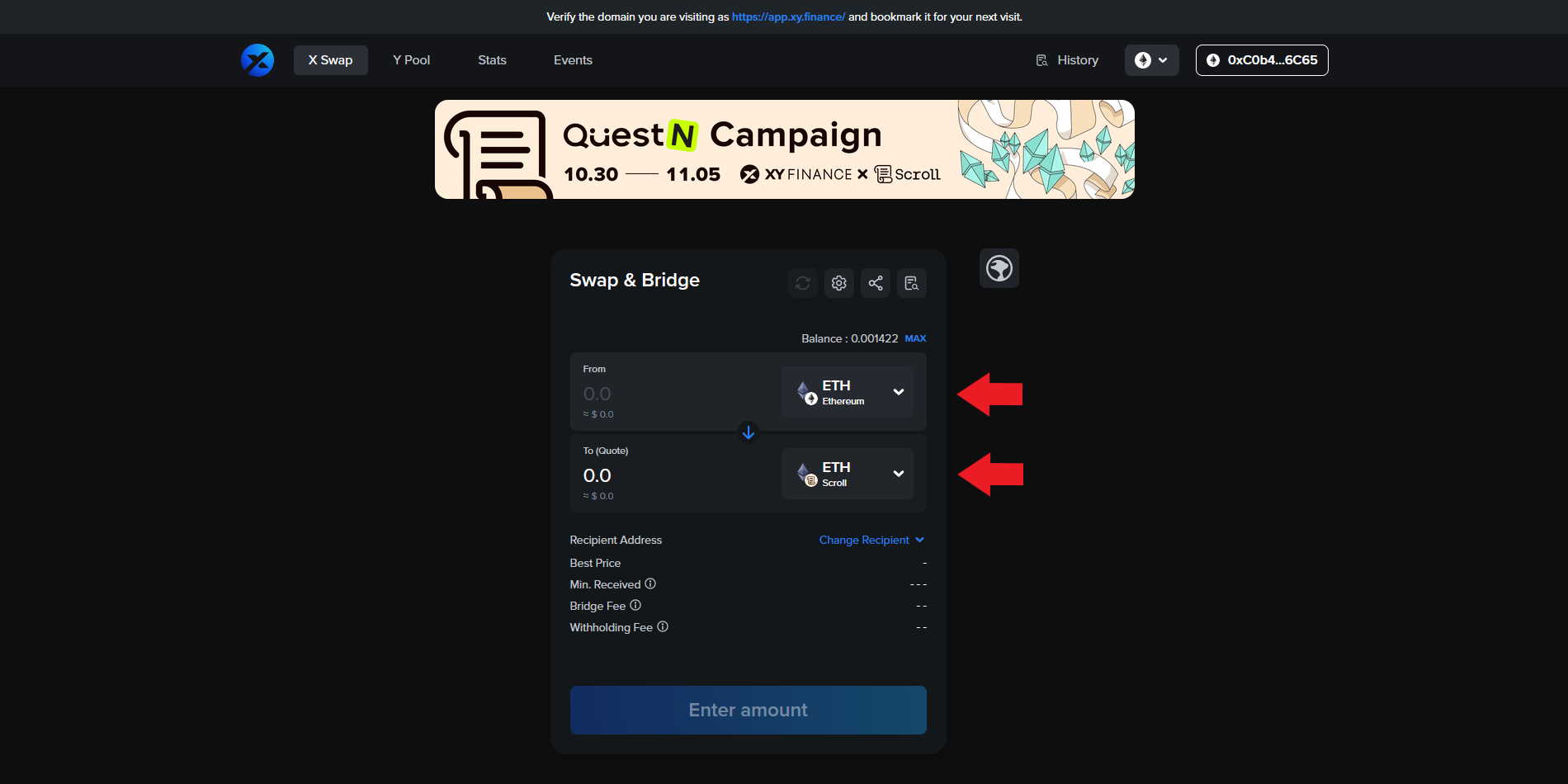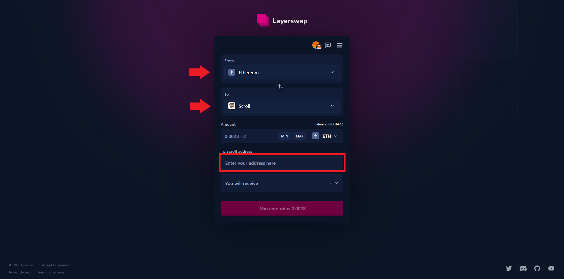 Next, set the "From" as Ethereum and set "To" as Scroll, then insert a quantity, now insert the destination wallet address (you can use MetaMask to auto-fill this) & finally confirm the transaction!