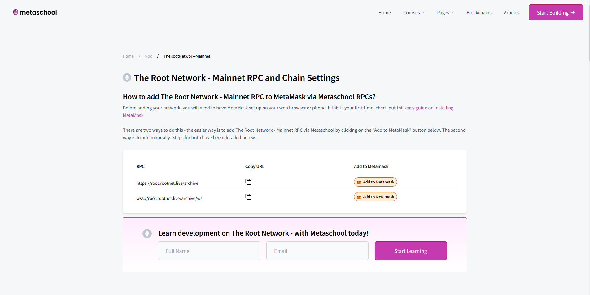 First, we need to add The Root Network to MetaMask, to do this, you can either go to metaschool.so/rpc/theRootNetwork-Mainnet & click "Add to MetaMask", or you can enter the network manually using the following details: