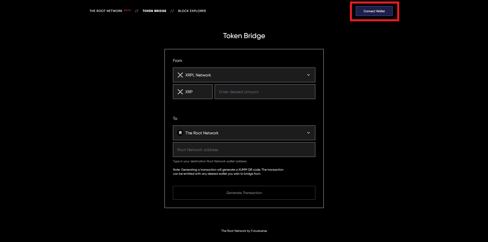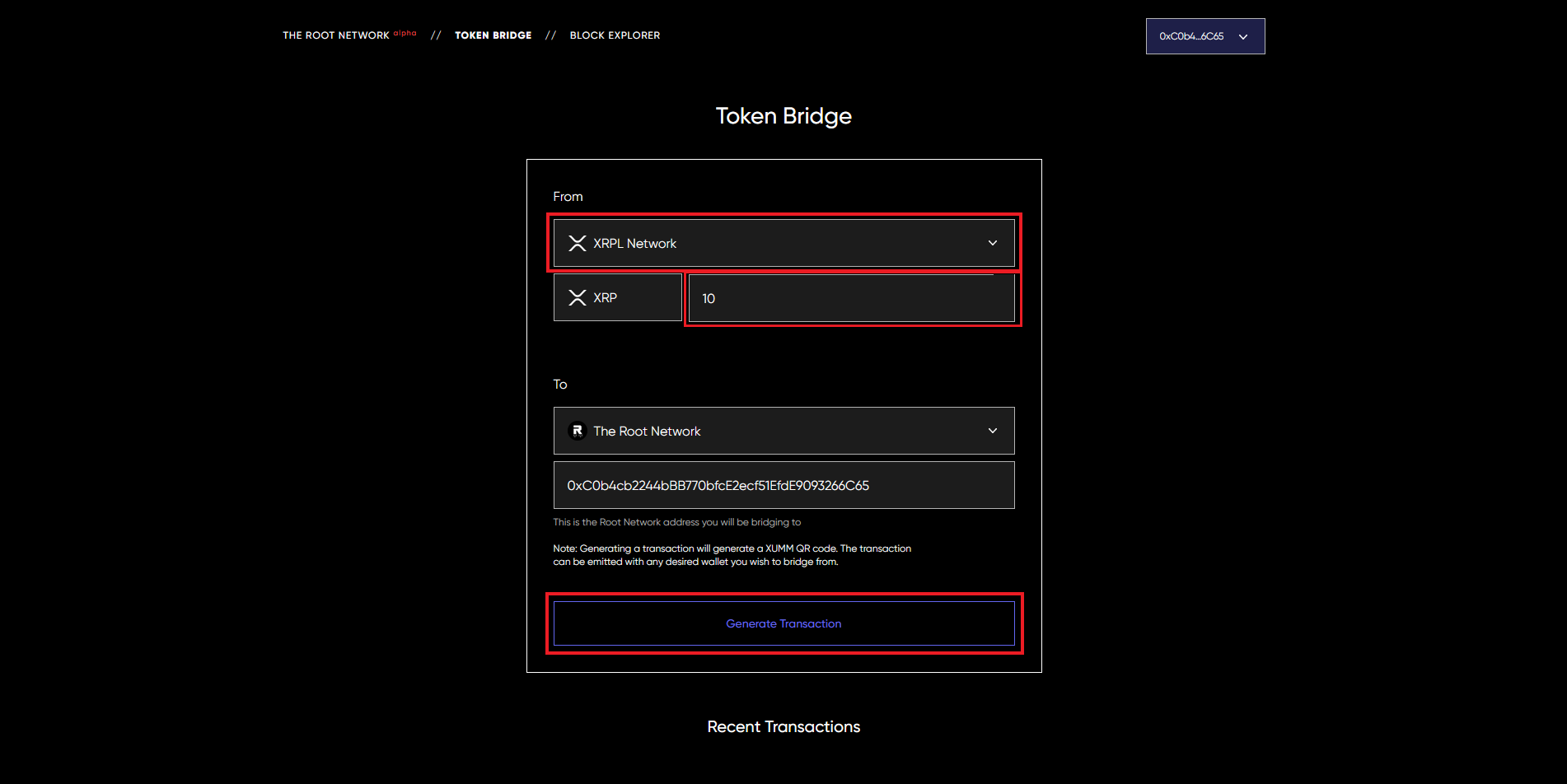 Now we need to make sure the "From" is set to "XRPL Network", then we need to insert an amount of XRP we want to bridge to Root Network, and finally we just need to insert our MetaMask address which is where The Root Network has been added.