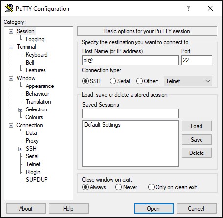 Where we can see "Host Name (or IP address)" box, we will type: pi@YOUR_RASP_IP make sure you insert your Raspberry Pi's IP address into that box after the @, then make sure the connection type is set to "SSH" then hit "Open".