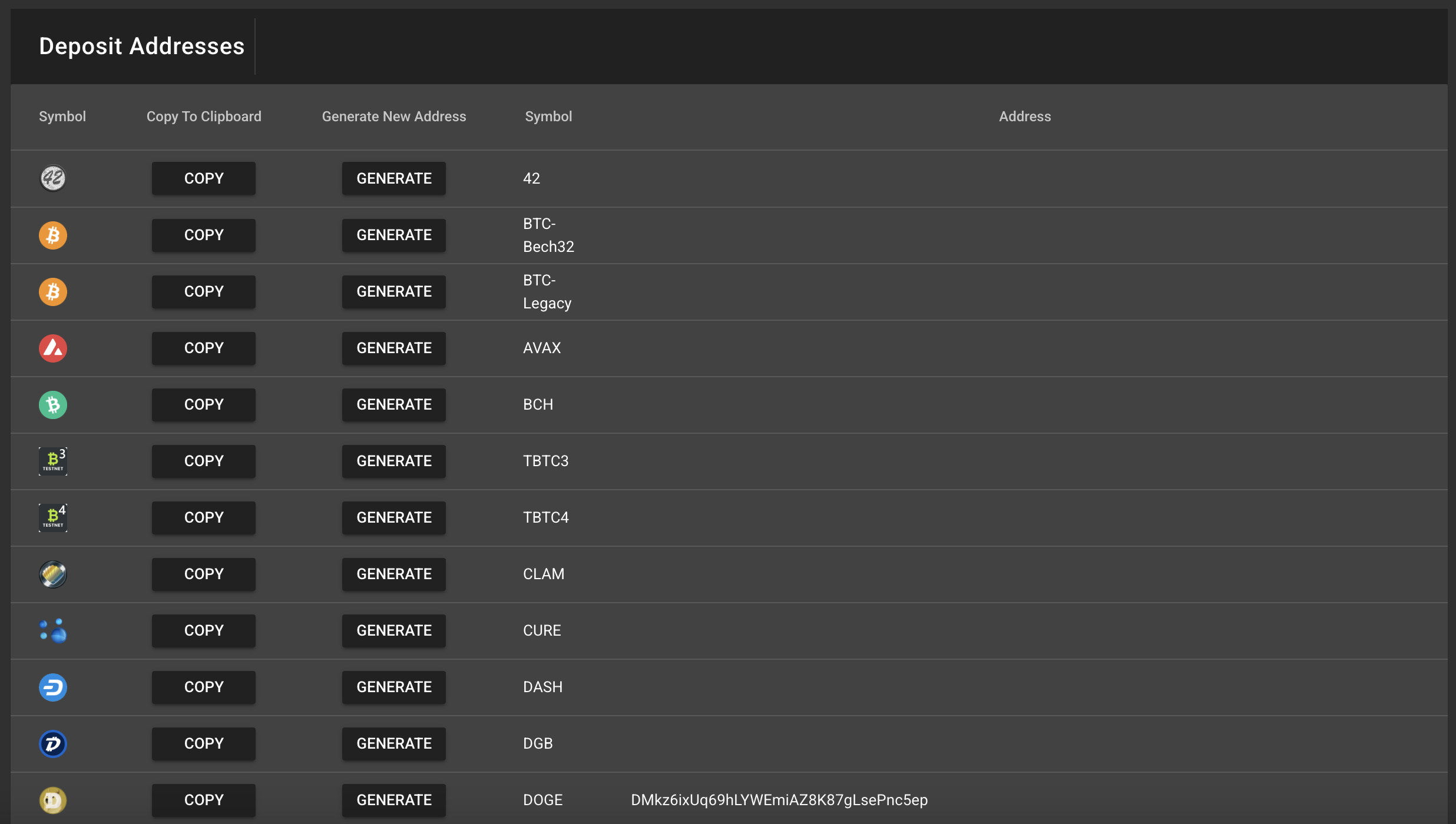 In my case, I will scroll down to Doge and press "Generate" button to generate a deposit address.