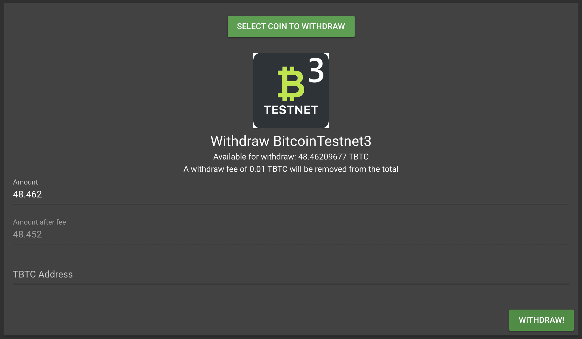 Then just input the amount you want to withdraw, and input your Testnet3 address and hit "Withdraw" button.