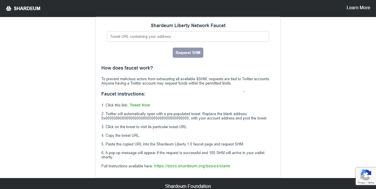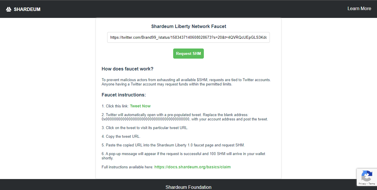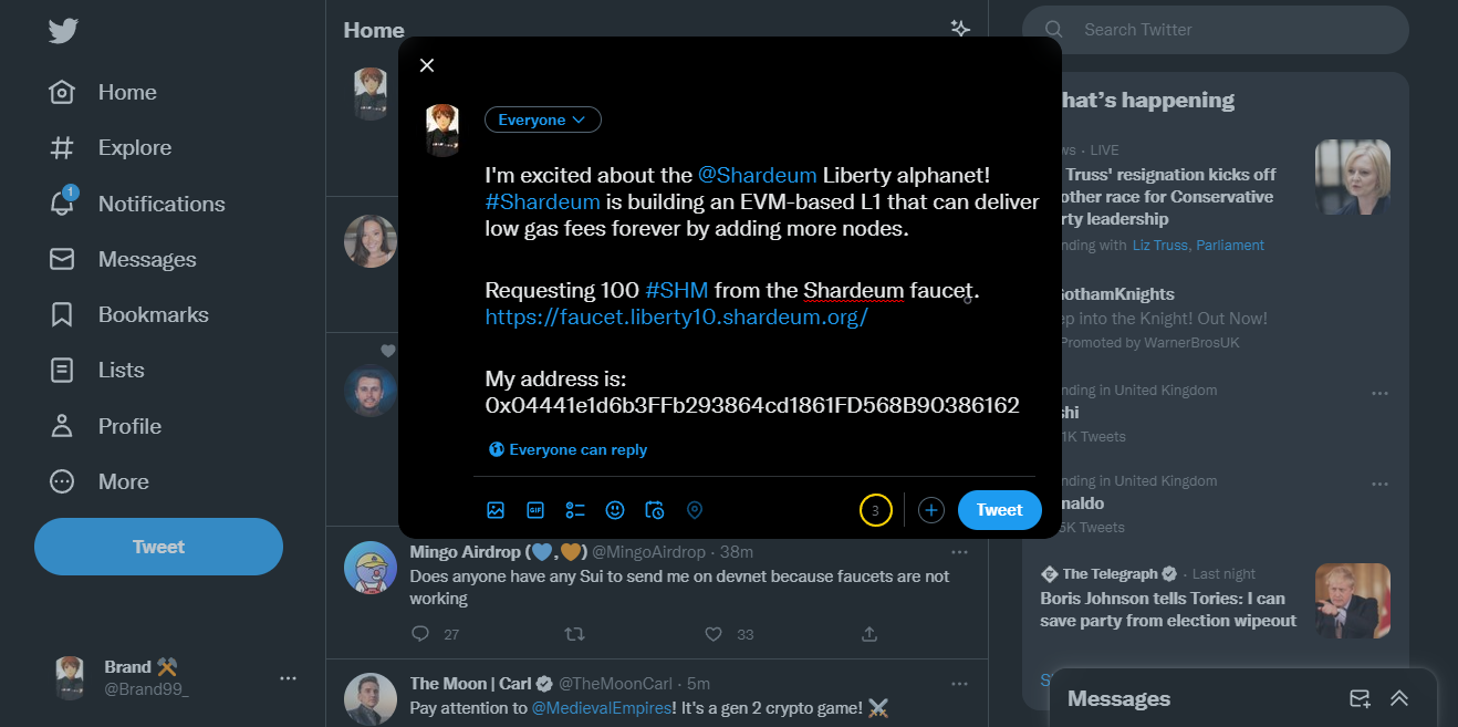 Now we can go ahead and begin the process to claim our testnet tokens, To do this you will need to open your Twitter account and then Click this link it should direct you to Twitter and generate a Tweet, edit the tweet & change the "0x000000..." to your own ETH address from MetaMask (You can find your ETH address just above the "0 SHM" balance)