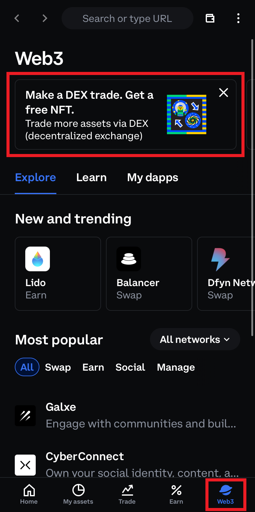 Then go to the Web3 tab on the bottom-right side & select the panel at the top that says "Make a DEX trade. Get a free NFT."