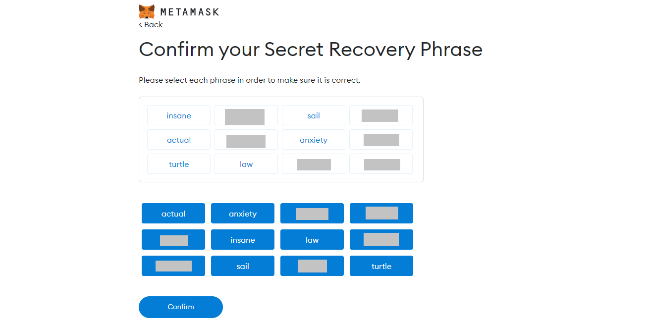 Select Next, you will then be asked to select the words in the correct order, once complete, you should be able to select Confirm.