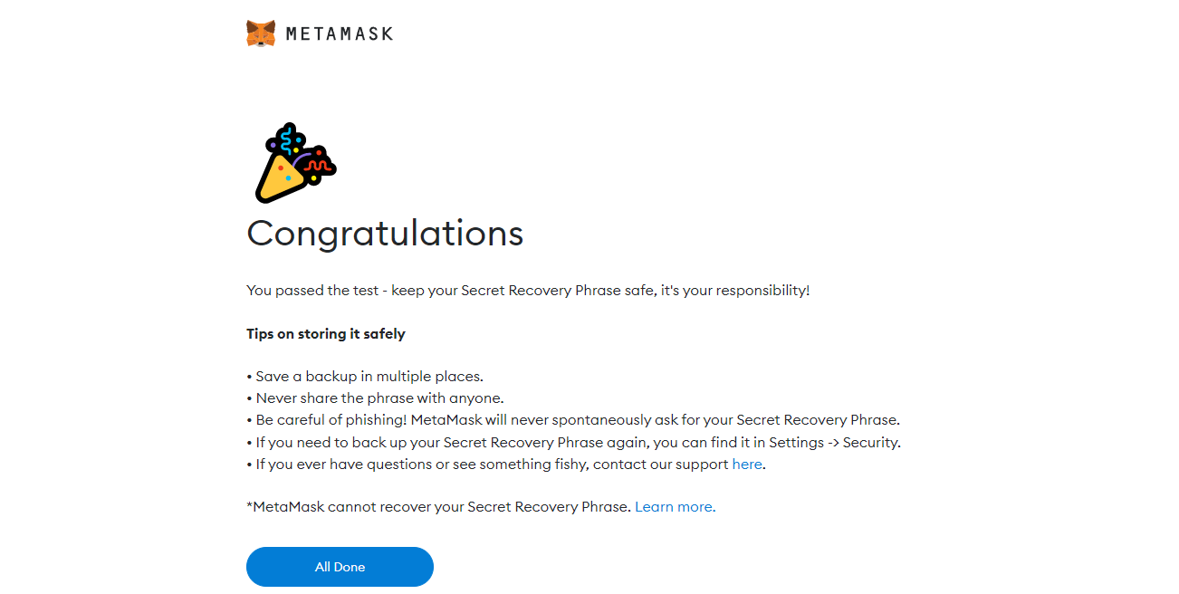 Congratulations! Your MetaMask wallet is now setup and ready to use!