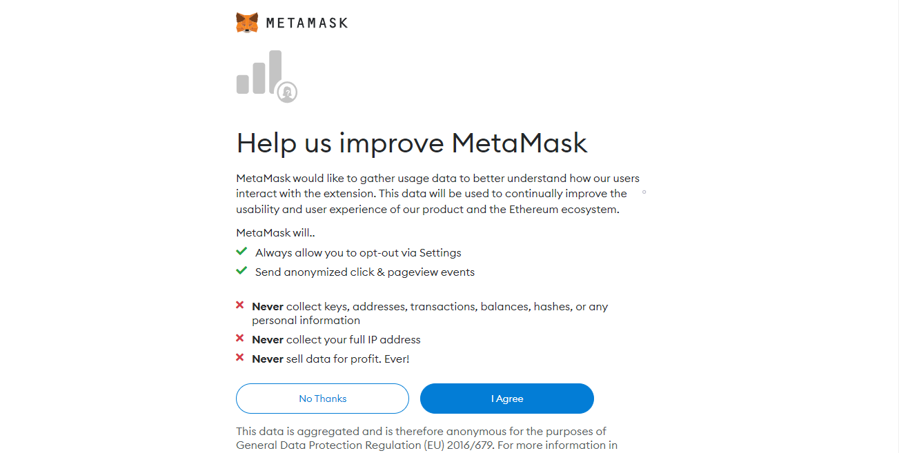 Next you might see a "Help us improve MetaMask" page, this choice is your own personal preference.