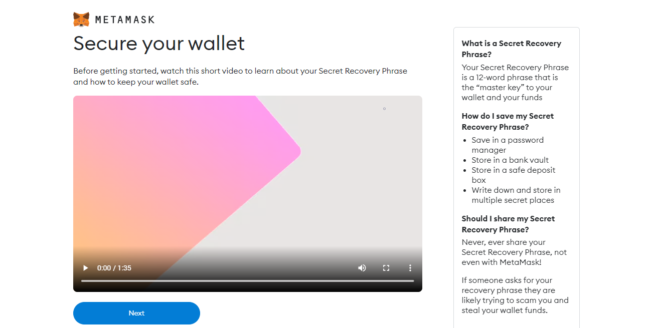 Recommended: Watch the video about Seed Phrases & Security, then proceed to the next step.