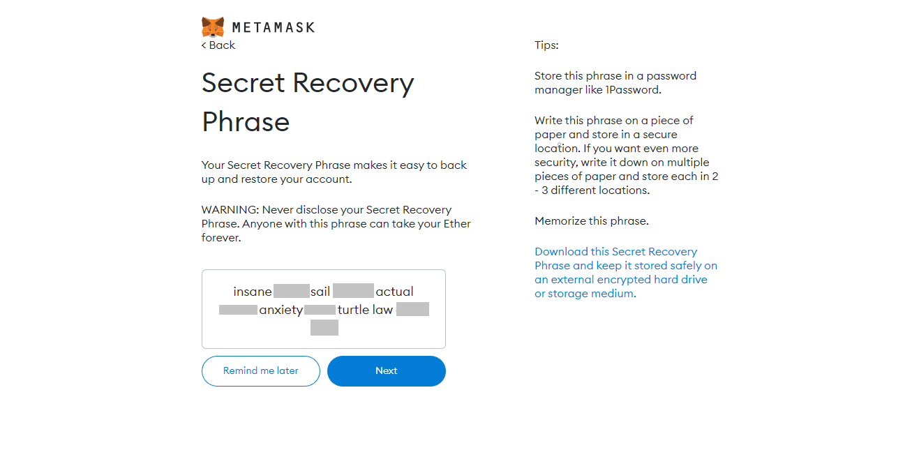 You should see an option to reveal your Seed Phrase, it should be 12 (or 24) random words, You need to copy these words in order and save them somewhere safe! You will need these words written down to verify on the next page.
