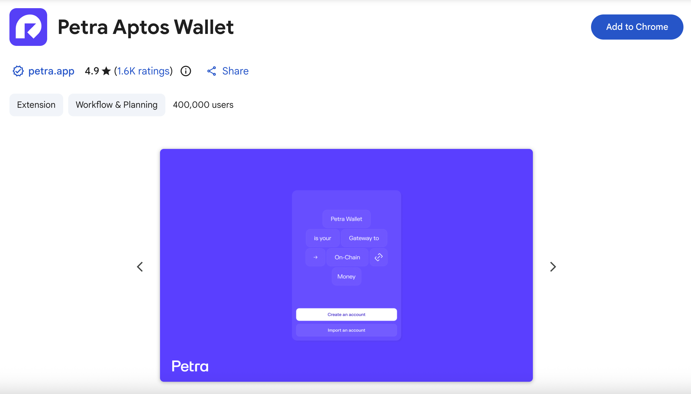 First, we need to open Google Chrome, then head over to the Petra Google Extensions page: chromewebstore.google.com/detail/petra-aptos-wallet & press Add to Chrome.