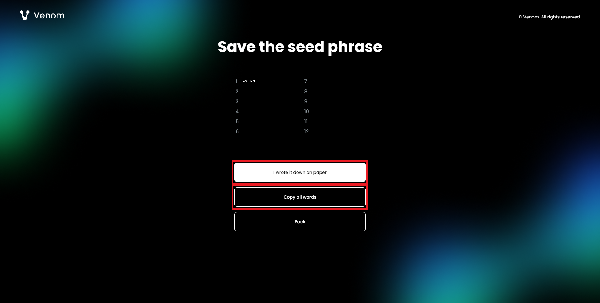 Copy your Seed Phrase down onto paper and store it somewhere safe, these random words are used to access your crypto/funds!