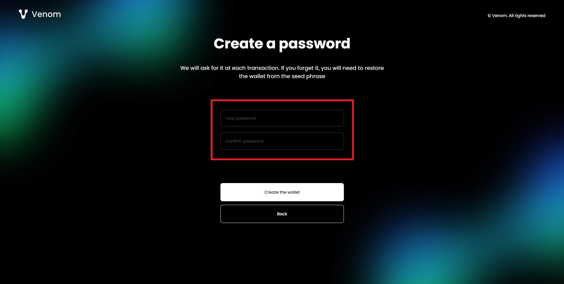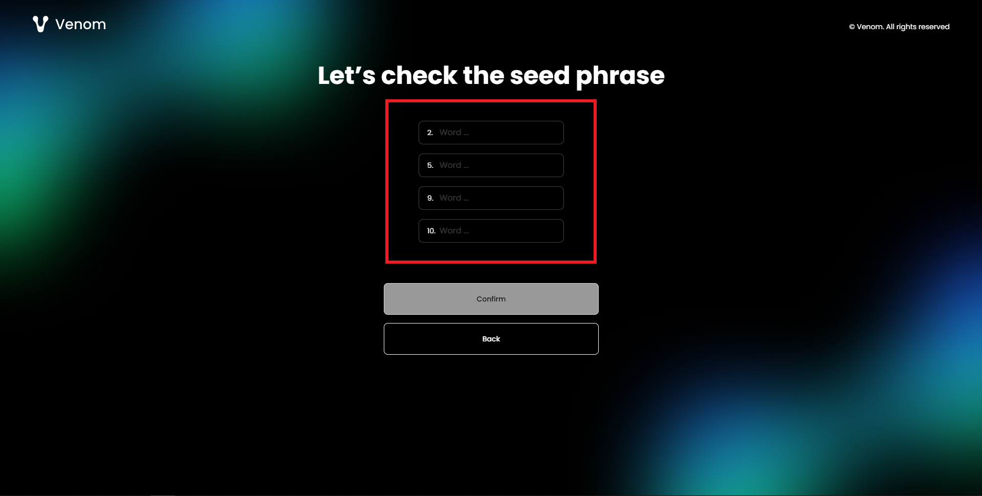 Now just verify your Seed Phrase by inserting the correct words, then hit "Confirm".