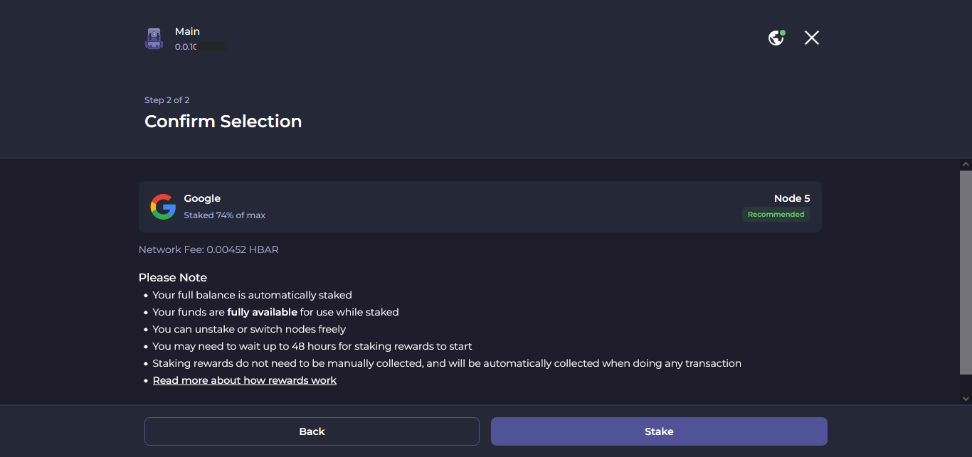 You're now staking HBAR on HashPack & can start collecting rewards every 20 hours!