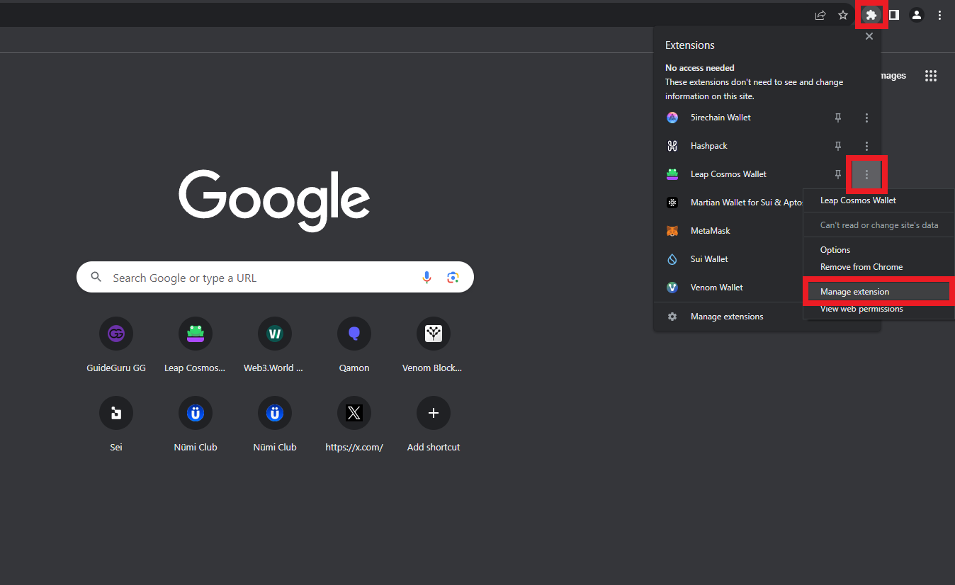 Now find the wallet app you normally use for Sei Network & select the 3 dots (ellipsis) to view the options, now select "Manage extension".
