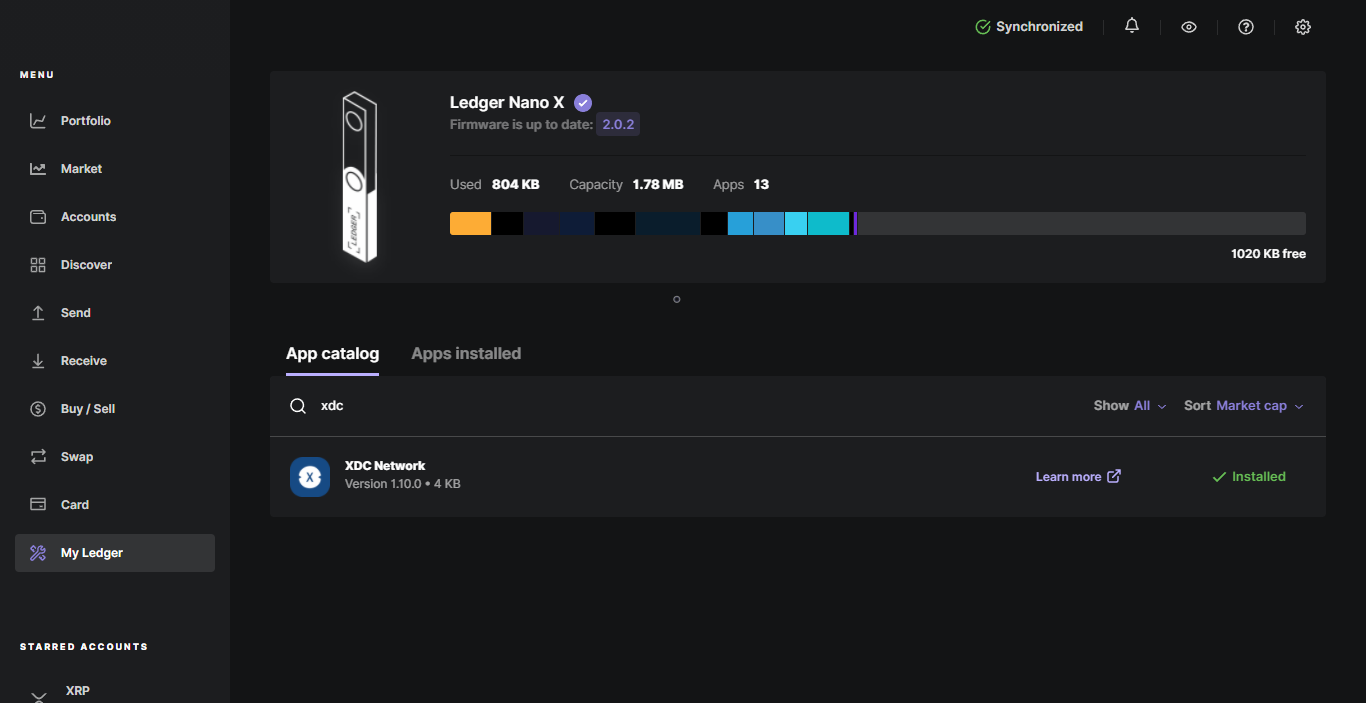 To do this, go to "My Ledger", then search the App Catalogue for "XDC Network" & press install.