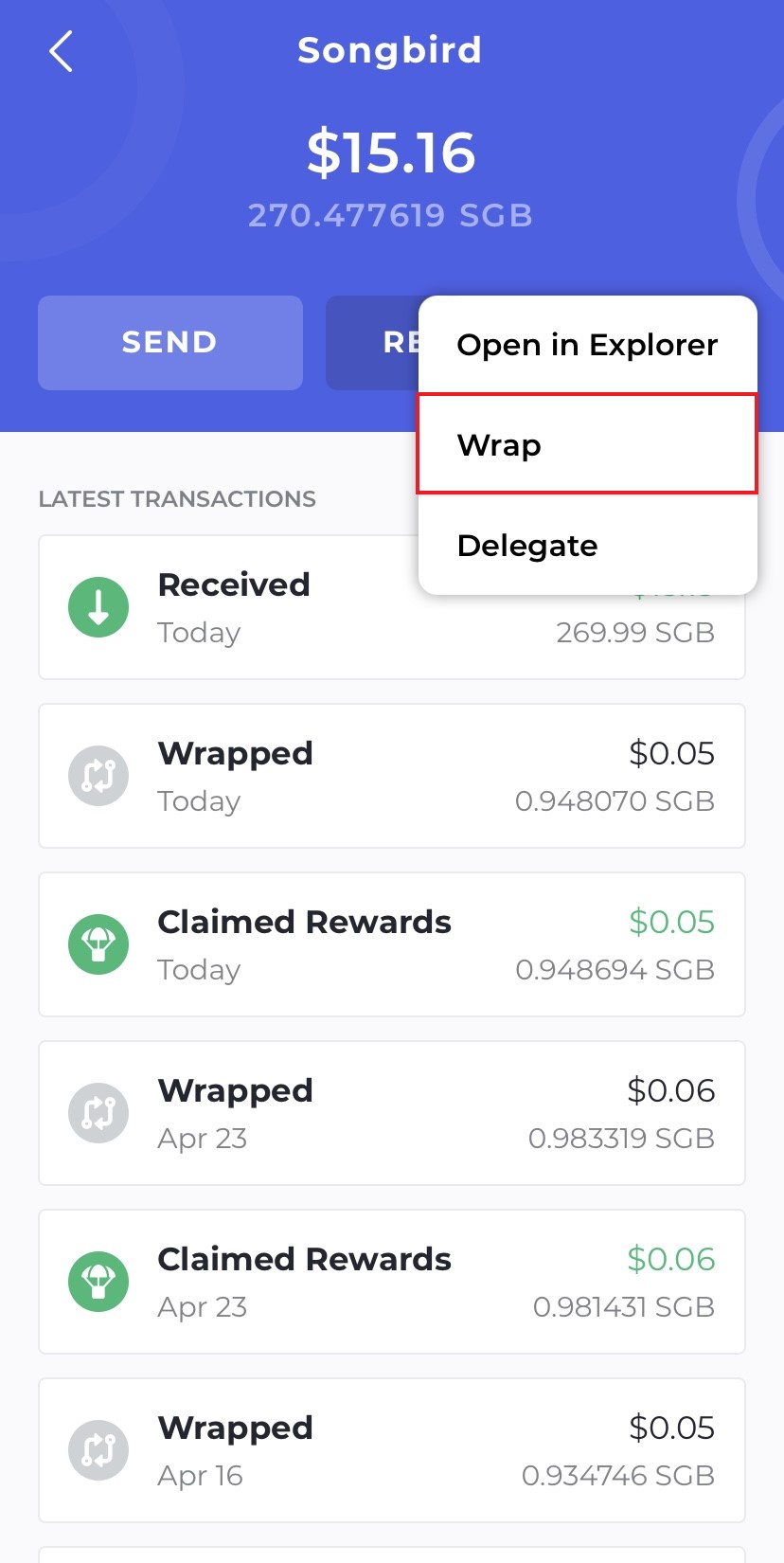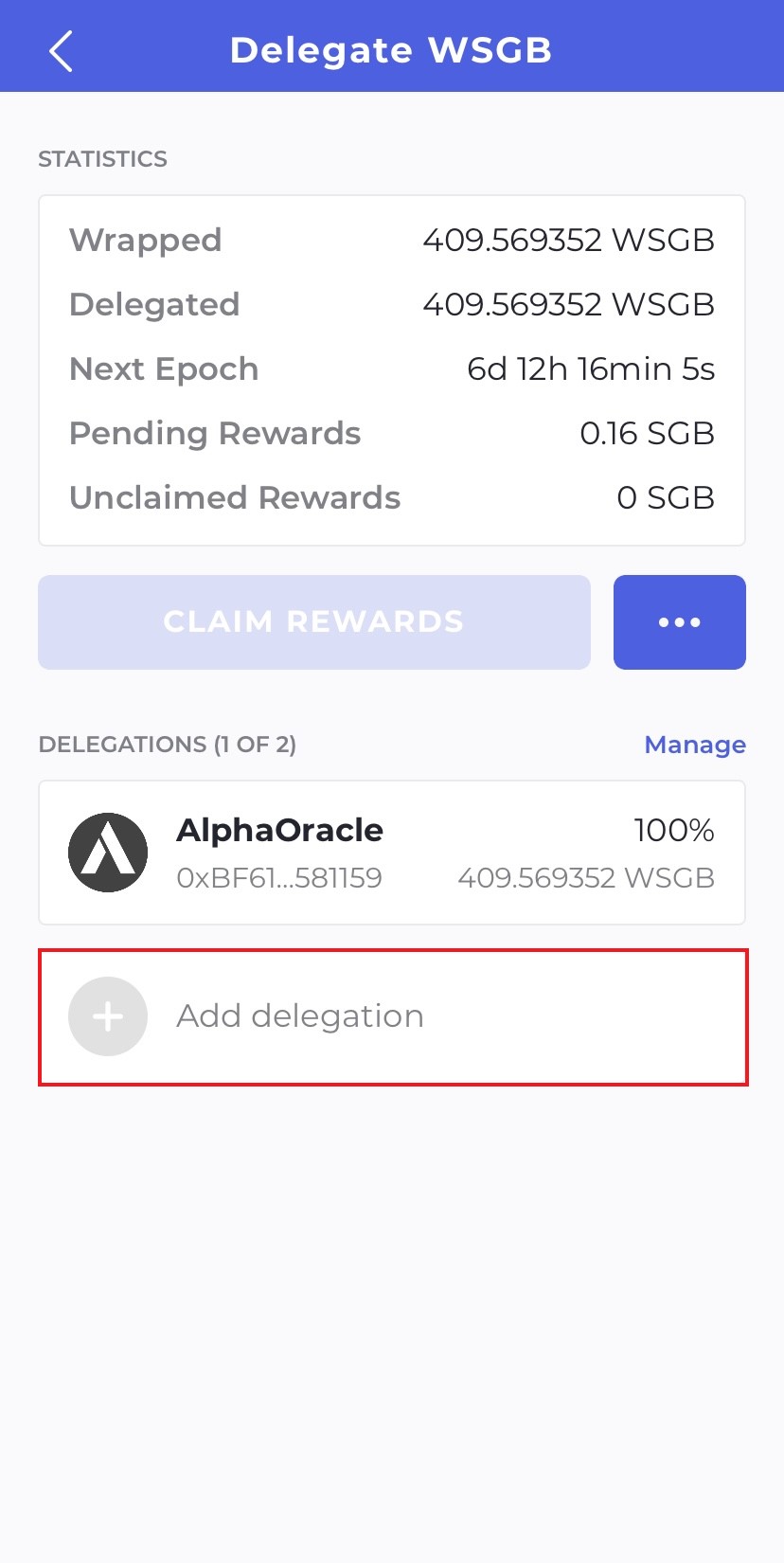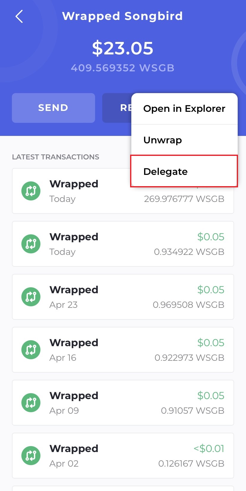 Again, we have to go back to the homescreen and this time we will select our Wrapped Songbird tokens and select "Delegate".
