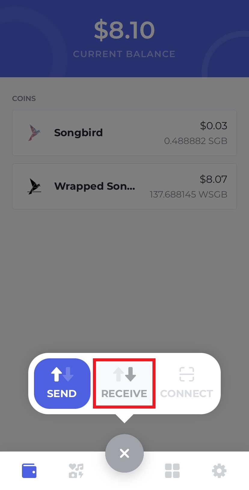 Next, we need to 'Receive' some SongBird tokens into our wallet.